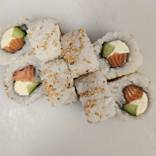Zalm, kappa, edamame, chuka wakame, mais, wortel, avocado, sesame mix, mayonaise en rode masago