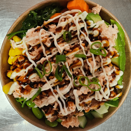 Zalm salade, kappa, edamame, chuka, mais, wortel, avocado, sesam mix en mayonaise